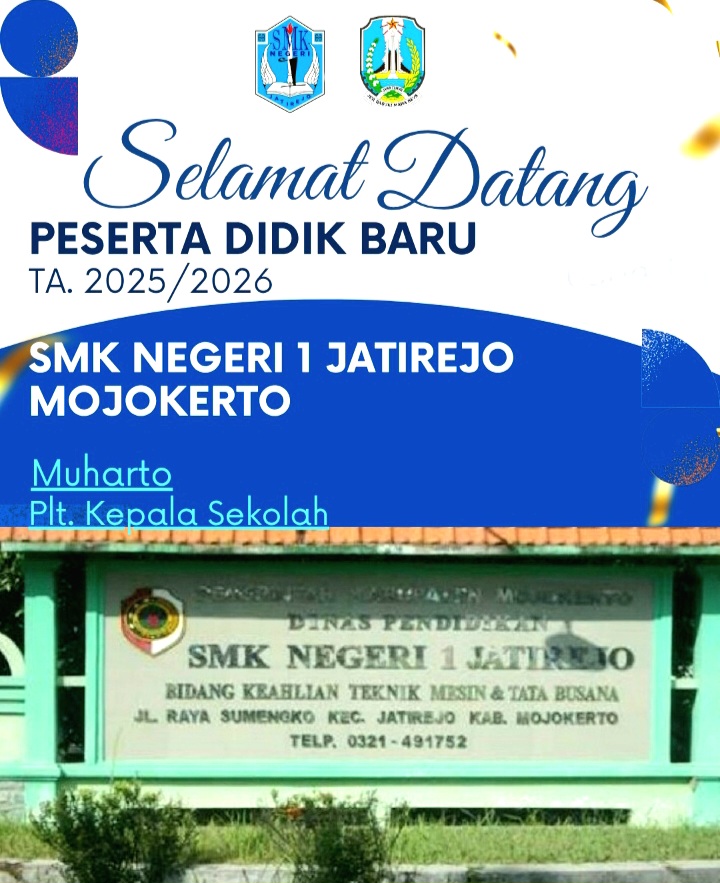 “Selamat Datang Peserta Didik Baru di SMKN 1 Jatirejo, Mojokerto Tahun Ajaran 2025-2026. Kita Cetak Sumber Daya Manusia yang unggul, sehingga mampu bersaing di dunia luar”. ADV