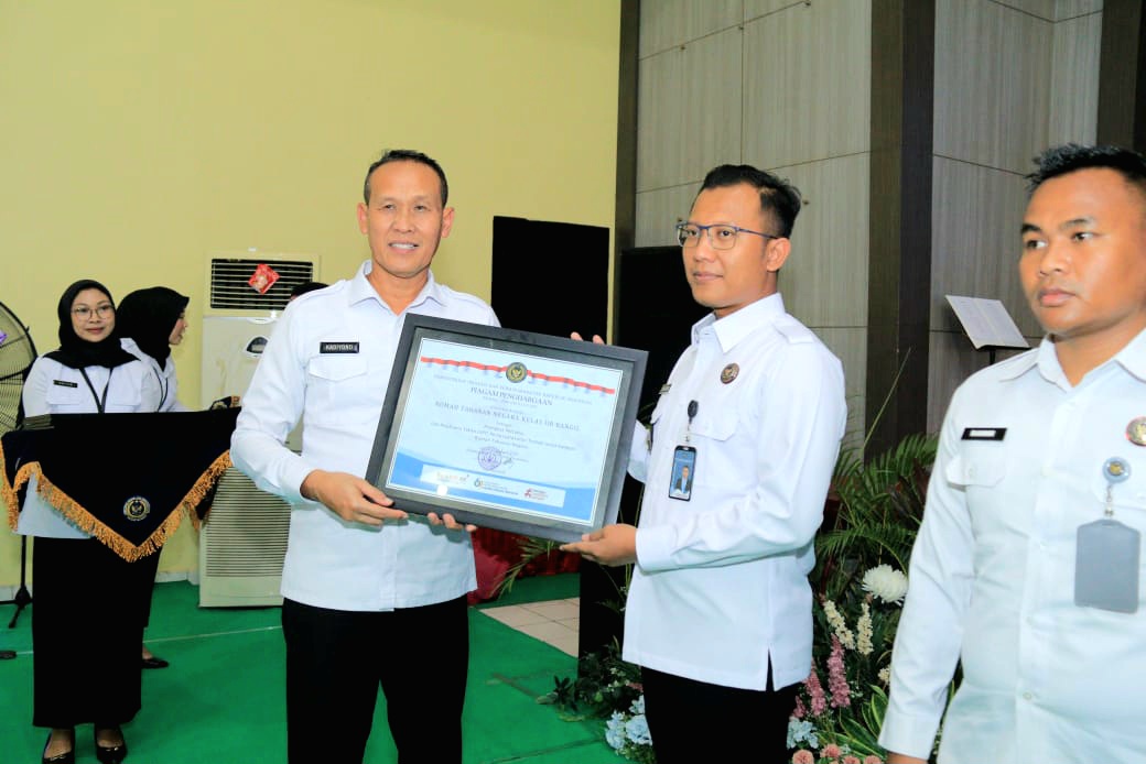 Sertifikat penghargaan diserahkan langsung oleh Kakanwil Ditjenpas Jawa Timur, Kadiyono, kepada Plt Kepala Rutan Bangil di hadapan seluruh peserta yang hadir secara langsung maupun daring. (Hum/Billy)l